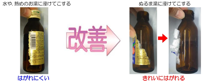 そこでラベルの糊付けについて検討し、室温や、水の中、結露がつくような冷えた状態でははがれにくいが、約40℃のぬるま湯に20分程浸けると簡単にはがれるラベルに変更しました。