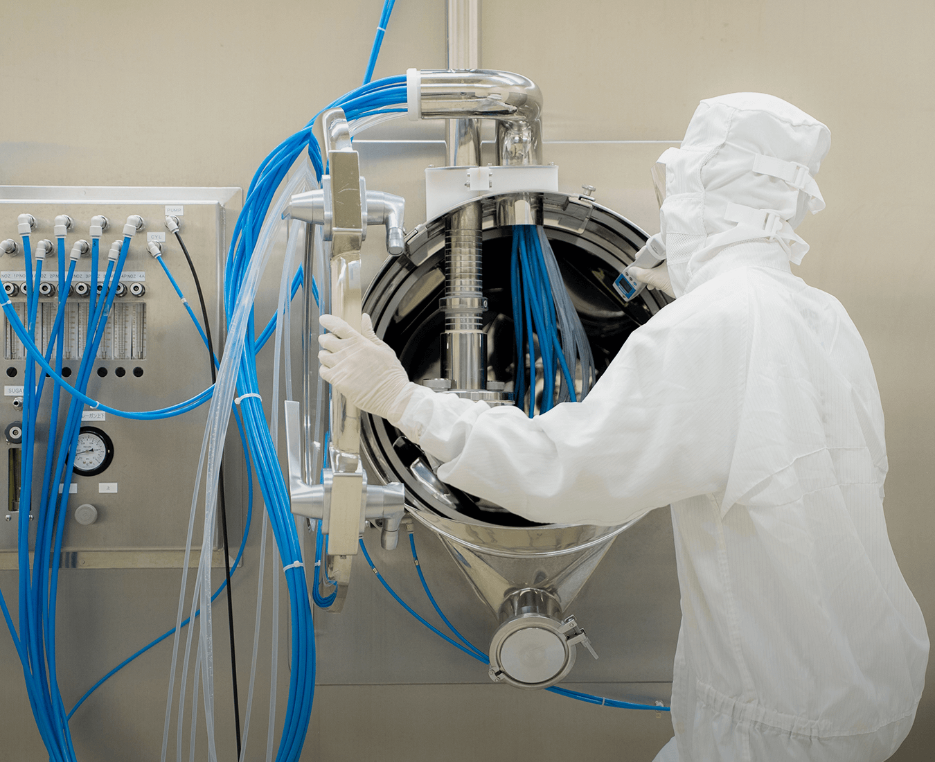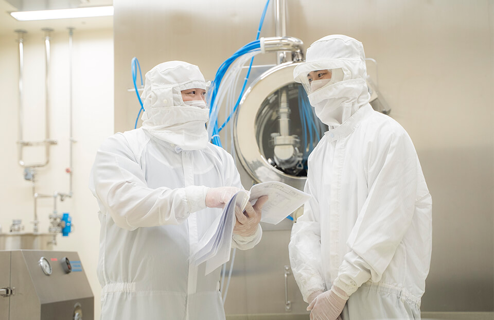原料の秤量・調製等を行い、錠剤、顆粒剤、または注射剤の製造や、出来上がった製品の包装に関わる業務を行います。異物が混入しないよう徹底した衛生管理の下、責任感を持って行う仕事です。