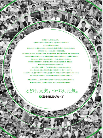 この広告デザインは、富士薬品グループで働く全従業員から募った写真で作られており、このスローガンを中心に一体となりながら広がっていく様子をイメージしています。